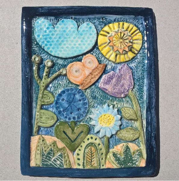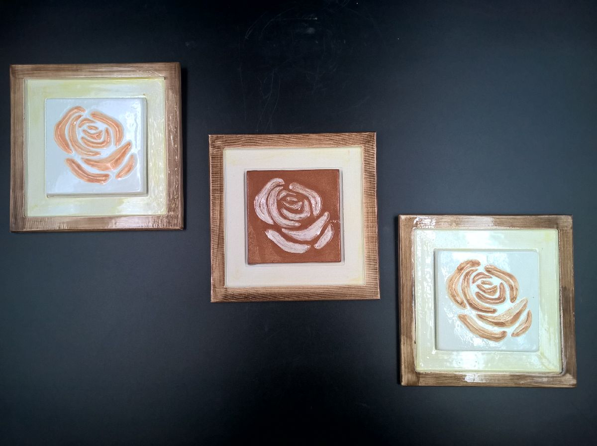 Komplet treh slik vrtnic v različnih barvah. Slike so v izdelane iz keramike, tudi okvirji.